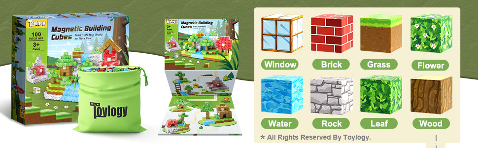 - 【PERFECT SENSORY MONTESSORI TOYS FOR KIDS】Combining the science of UV technology and magnetism which make your building arts more vivid and realistic than those of simple pure colored cubes, 100pcs magnet world set offers a wealth of patterns: water, grass, wood, rock, leaf, brick, flower, and window. More cubes, more possibilities to unleash kid's creativity. Kids will get everything to decorate their little castle or red brick city for their dolls. And they can even build a forest parking lot to park their toy cars.