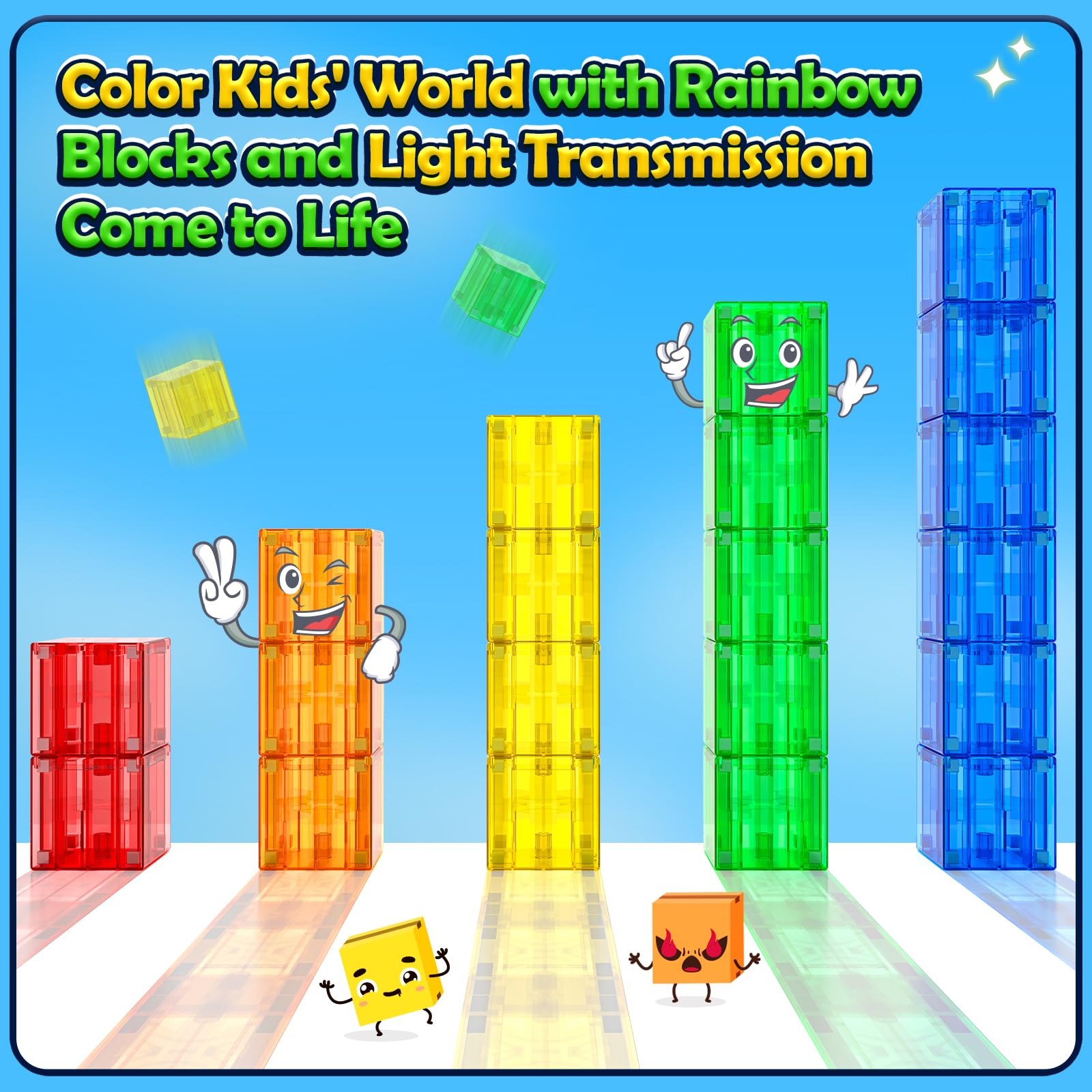 - 【Transparent Color Magnet Blocks】 Including 7 colors magnetic blocks , a storage bag and an idea booklet. Marvel at our crystal-clear blocks, creating fascinated reflections and shadows that will captivate kids ages 3-8, sparking creativity while building dazzling structures that glow with imagination.